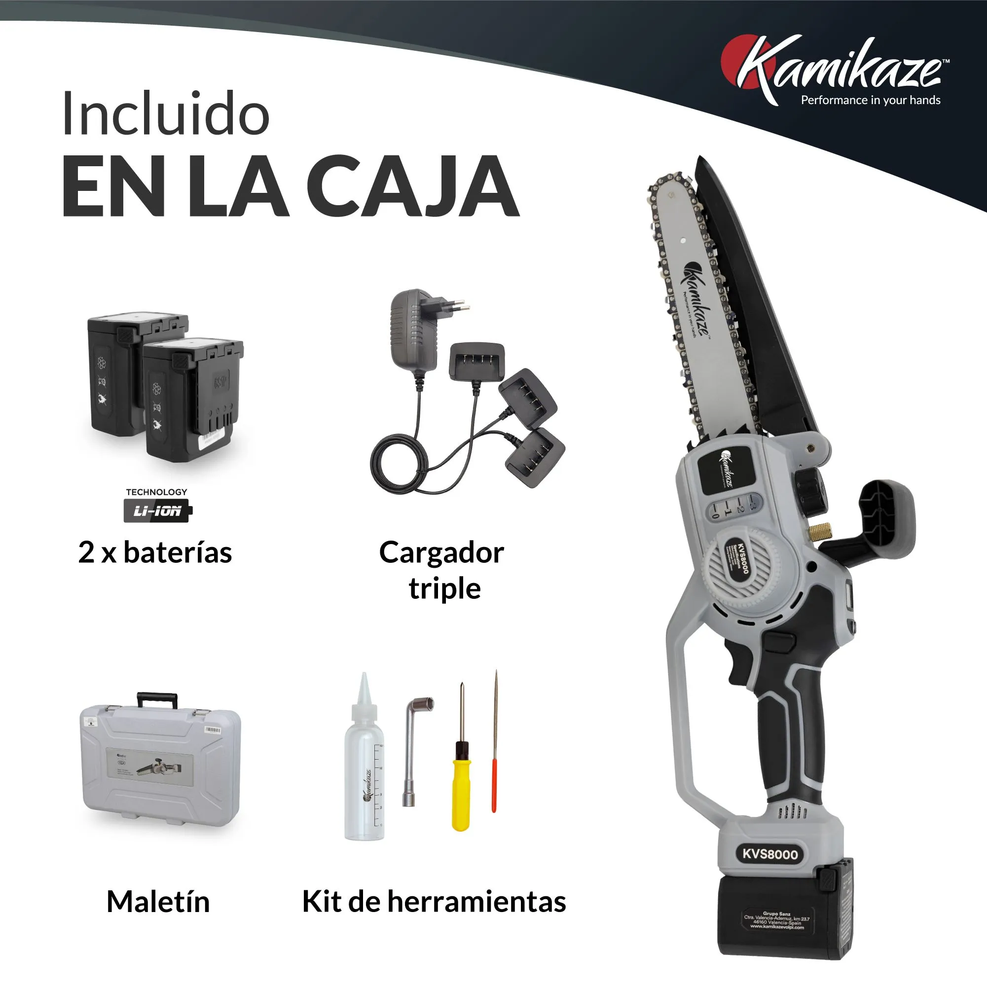 La sierra eléctrica KVS 8000 para uso profesional e inalámbrica, tiene 1,5 kg de peso y una autonomía de 2-4 horas. Dispone de pantalla inteligente y bomba de engrase automático. Con 2 baterías incluidas. Recomendada para su utilización en viña, olivos y árboles frutales.