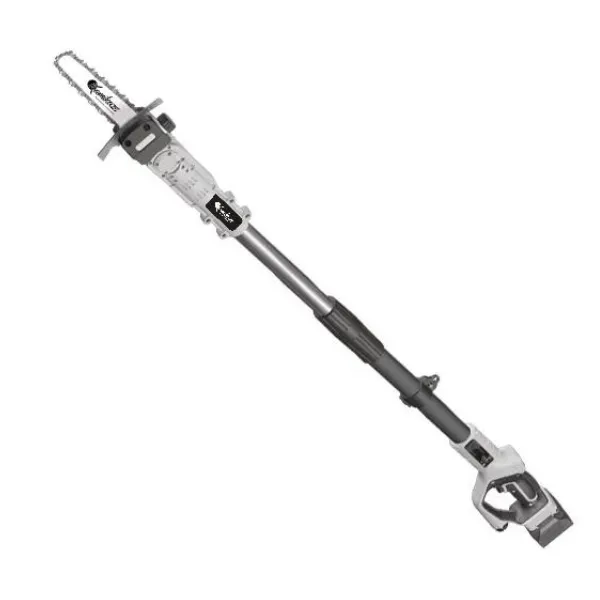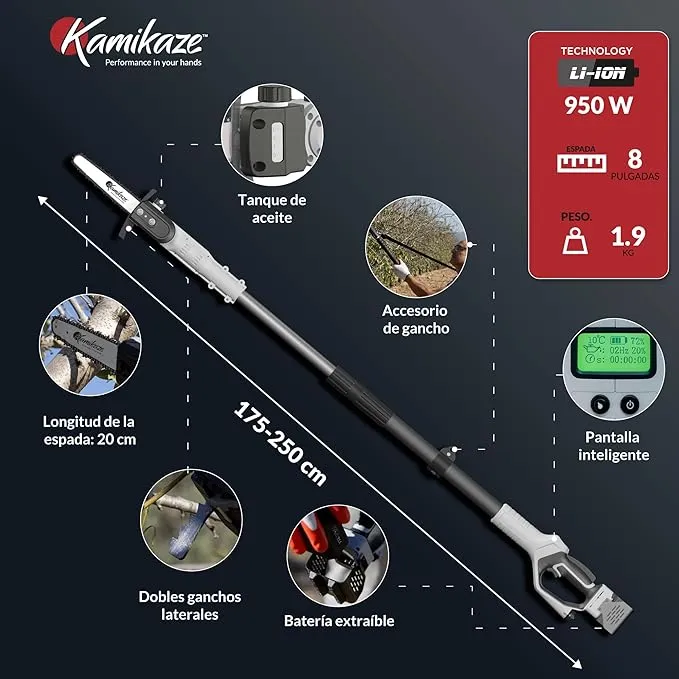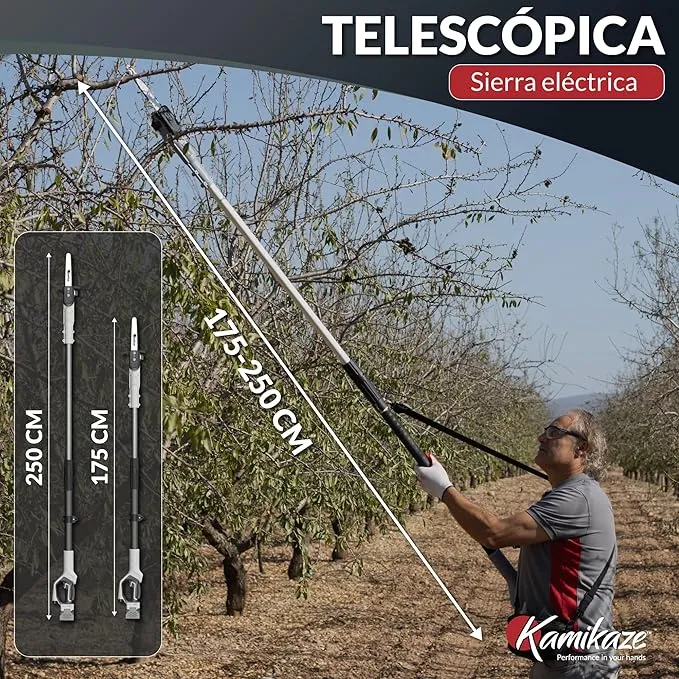 La nueva Kamikaze KVS 7000P es una motosierra eléctrica con pértiga telescópica sin cables. Extensible desde 1,75 a 2,5 metros, sumado con la altura del usuario se logra trabajar a alturas entorno a los 4,5 metros.