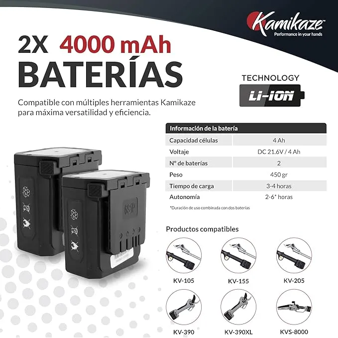 Incluye 2 baterías de litio de 4,0 Ah para mayor duración. Viene con un cargador de triple ranura que puede cargar hasta 3 baterías al mismo tiempo. Además, incluye un kit de herramientas para el mantenimiento de la motosierra y una funda protectora para la espada, que ayuda a mantener la hoja en buen estado y lista para usar.
